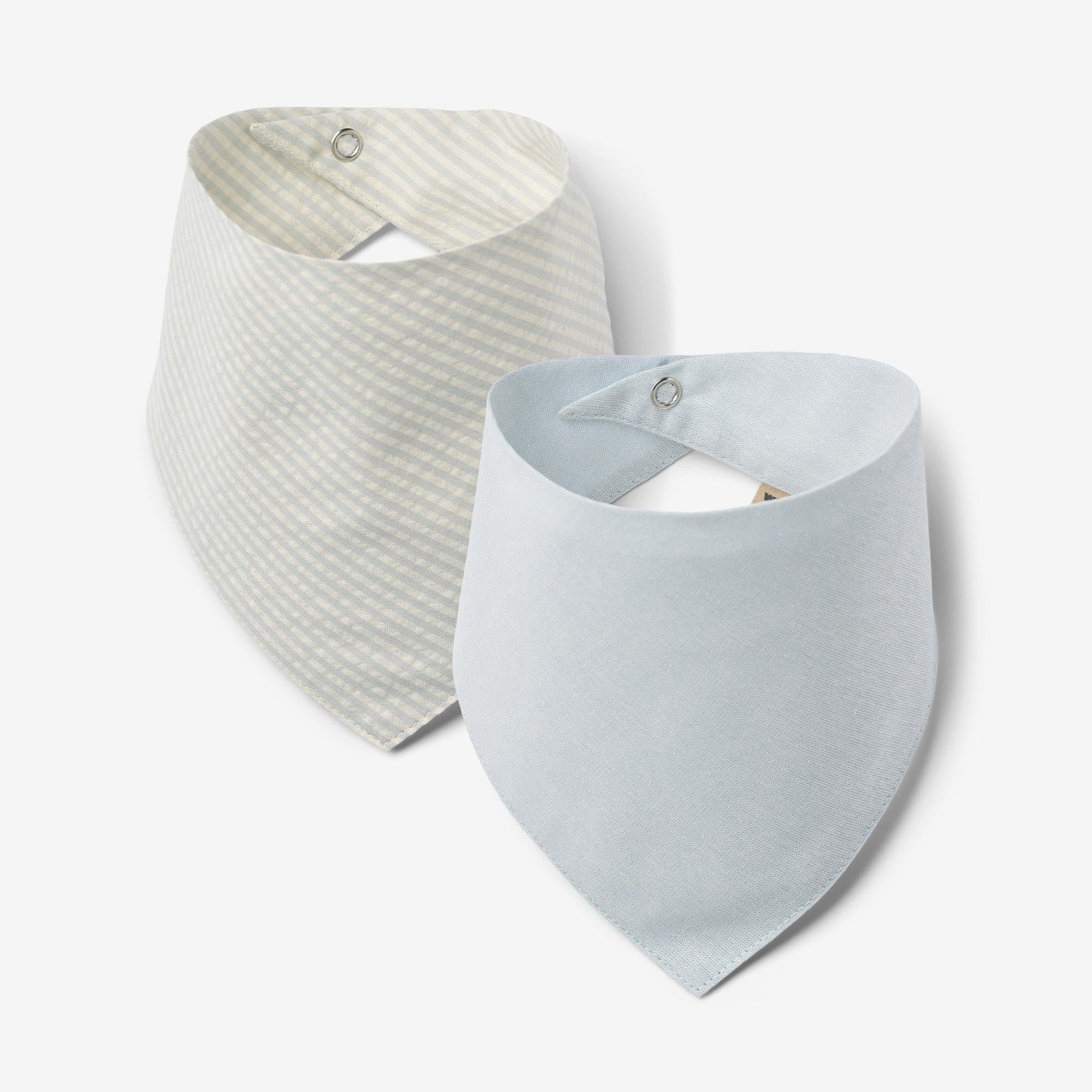 Practical set of two bibs in soft woven organic cotton for babies.
